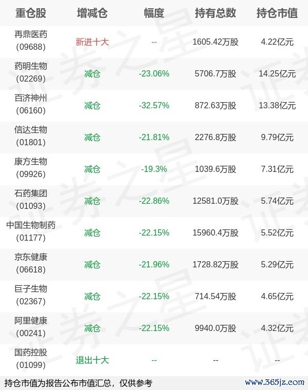 本站消息,4月22日博时基金旗下万琼管理的博时恒生医疗保健交易型开放式指数基金(QDII)公布一季报,近1年净值增长率38.19%。与上一季度相比展鹏配资,该基金前十大重仓股新增再鼎医药;其中药明生物持仓占比10.82%,为该基金第一大重仓股;国药控股等退出前十大重仓股;详细数据如下:
